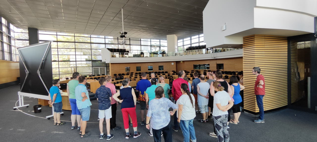 Weiter ging es mit einem Besuch im Plenarsaal. Es wurde uns erklärt, wie sich die Sitzordnung ergibt, wer wann und auch wie lang sprechen darf und welche verschiedenen Räume dazu gehören. Natürlich haben wir alle Platz genommen und unsere ganz eigene Plenarsitzung abgehalten. Thema war: Die Erhöhung des Werkstattentgeltes. Es haben sich einige getraut, nach vorn zu gehen um am Rednerpult zu sprechen.