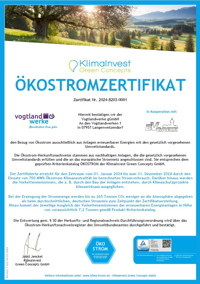 Die Vogtlandwerke gGmbH beziehen ihren Strom zu 100% aus erneuerbaren Energien