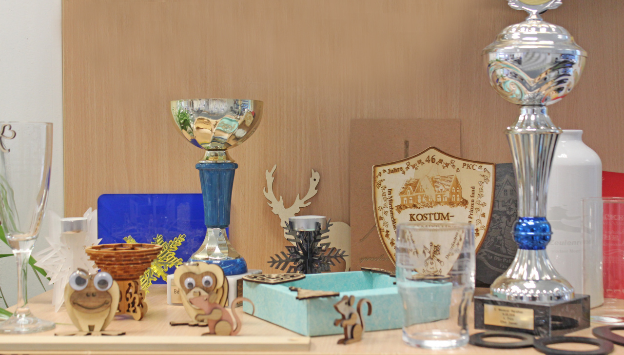 Das gilt auch für unsere Laserarbeiten. Auch hier ist unser Angebot sehr umfangreich. Die Materialien reichen von herkömmlichem Lasermaterial über Acryl, Holz (Bretter), Schiefer, Keramik, Glas (Trinkgläser), Leder, Karton, Papier, Lebensmittel (z.B. Obst) bis hin zu einigen Metallen (z.B. Besteck).