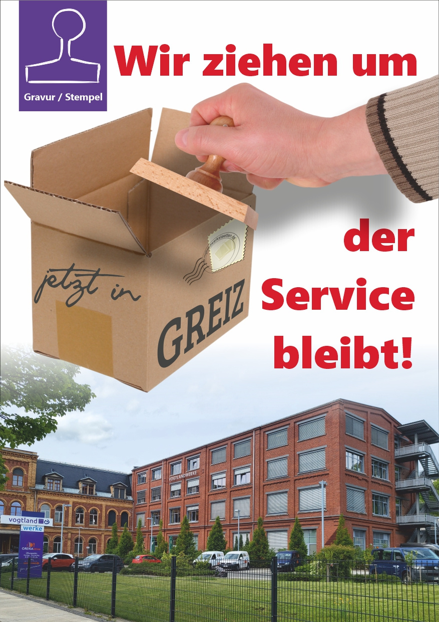 wir möchten Sie darüber informieren, dass unsere Stempel- und Gravurabteilung ab dem 04.08.2025 am Standort Greiz beheimatet ist.