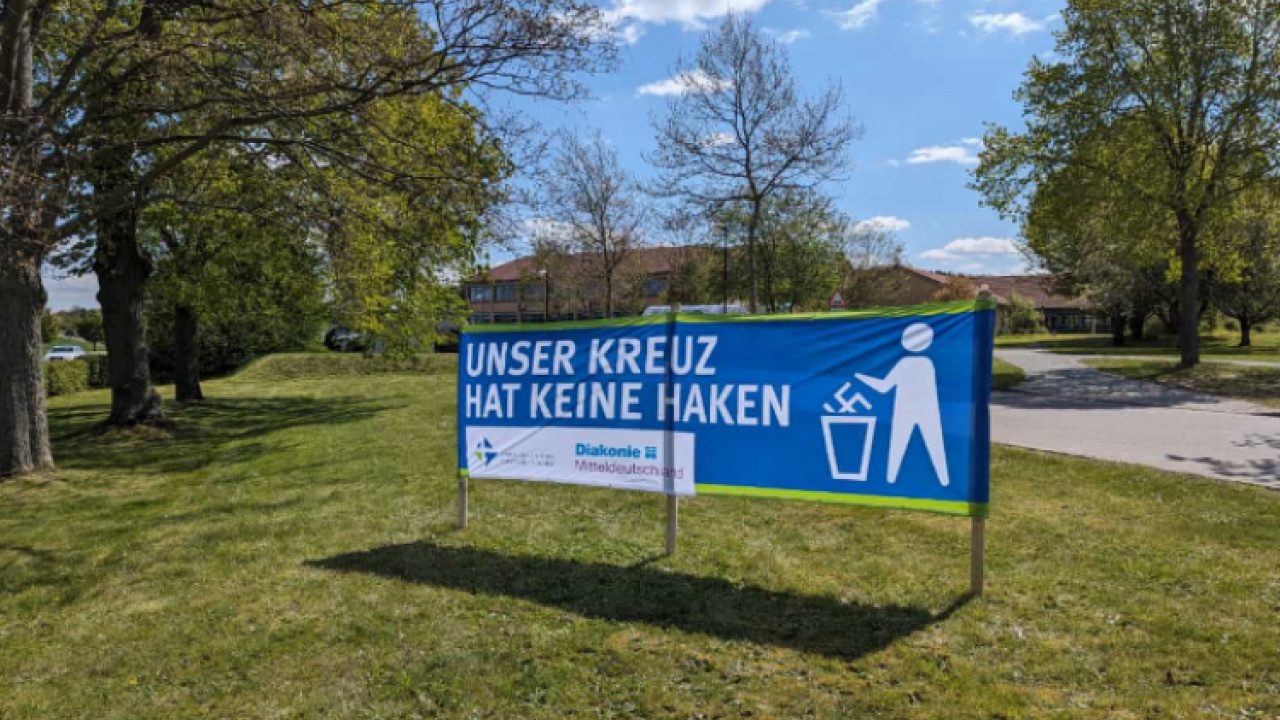 Vor dem Hintergrund der aktuellen politischen und gesellschaftlichen Situation, haben die Vogtlandwerke am Freitag, 26.04.2024 das Banner "Unser Kreuz hat keine Haken", eine gemeinsame Grafik von Landeskirche und Diakonie Mitteldeutschland auf dem Werkstattgelände in Naitschau aufgehangen.