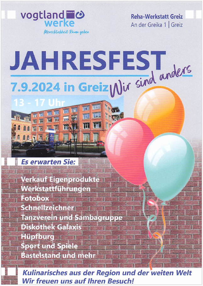 7.9.2024, 13 - 17 Uhr in der Reha-Werkstatt Greiz