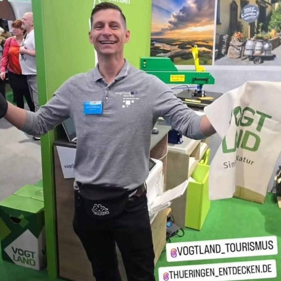 Seit vielen Jahren unterstützen die Vogtlandwerke den Messestand des Tourismusverbandes Vogtland e.V. auf der Grünen Woche in Berlin. Unsere begehrte Fotoaktion, bei der sich Messebesucher vor einem Motiv aus dem Thüringer Vogtland fotografieren lassen und ihr Bild, auf einem Stoffbeutel bedruckt, als Souvenir mit nach Hause nehmen können, war wieder ein voller Erfolg. Wir haben ca. 3000 Stoffbeutel an die Messebesucher verteilt.