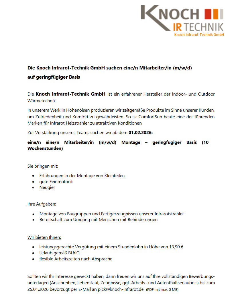 Für unser Tochterunternehmen Knoch Infrarot-Lichttechnik GmbH suchen wir: