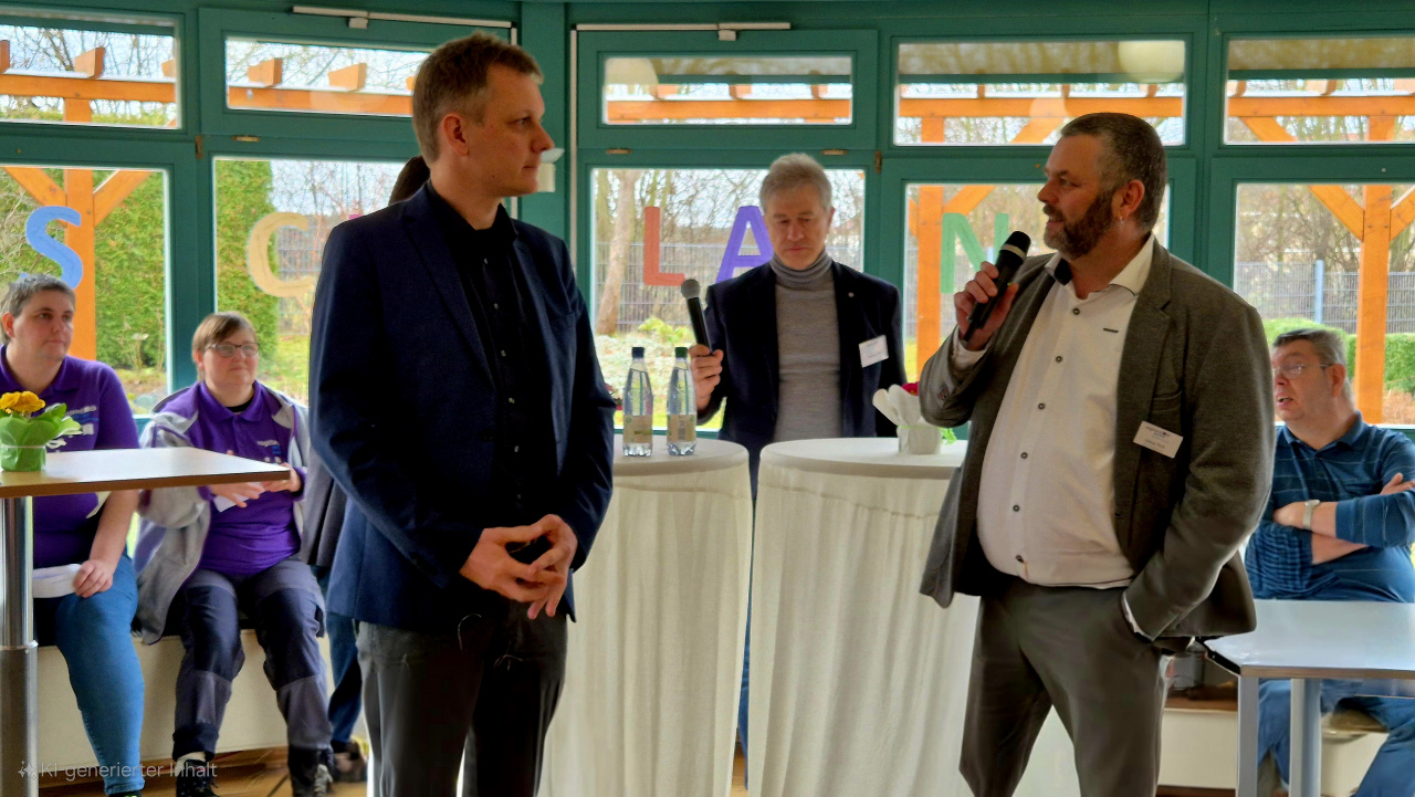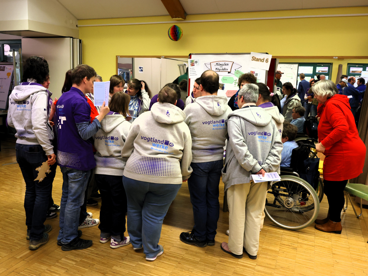 Die Spannung stieg mit jedem Tag mehr für die ca. 220 Beschäftigten mit Handicap in der Hauptwerkstatt Naitschau der Vogtlandwerke gGmbH. War es am 20.04.2023 ein großes, im Foyer der Werkstatt aufgehängtes Fragezeichen welches für Verwunderung sorgte, kamen dann mit jedem weiteren Arbeitstag neue Begriffe wie zum Beispiel Wahl, Partei, Stimme oder Grundgesetz hinzu, die die Neugier weiterwachsen ließen. Am 05.05.2023, dem bundesweiten Protesttag für Gleichstellung und Barrierefreiheit, war es dann endlich soweit. Die Kick-Off-Veranstaltung zum Demokratieprojekt „Meine Stimme zählt“ der Vogtlandwerke, ein thüringenweit einmaliges Projekt zur Demokratieförderung für und mit Menschen mit Behinderung, konnte starten.